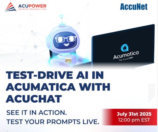Join AcuPower and AccuNet for a live test drive of AcuChat — an AI assistant built for Acumatica users who want faster answers, fewer clicks, and less time lost in reports.
